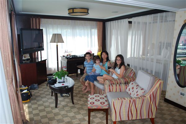 Tanto os cruzeiros curtos quanto os longos são feitos em apenas uma direção. Embarcamos em Xangai no dia 26 de julho de 2009. Embora o embarque estivesse marcado para as 15h, a tripulação nos recebeu com prazer quando chegamos cerca de uma hora antes. Funcionários vestidos como gondoleiros nos recepcionaram e levaram nossa bagagem diretamente para a nossa cabine. A bordo, fomos informados de que havia opções de upgrade. Achei os preços razoáveis, então fizemos um upgrade em uma das nossas duas cabines. Essa seria a cabine das meninas, para minha esposa e minhas duas filhas, e meu filho e eu ficamos na cabine menor. Durante o dia, a suíte grande tinha espaço de sobra para todos nós. 100% das cabines têm varanda. O tamanho das cabines é comparável ao de um grande navio de cruzeiro.