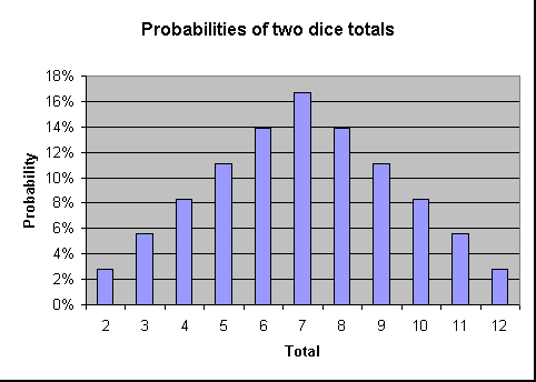 A tabela a seguir mostra a probabilidade de obter cada total. Como a tabela demonstra, quanto mais próximo de 7 for o total, maior será a probabilidade de obtê-lo.