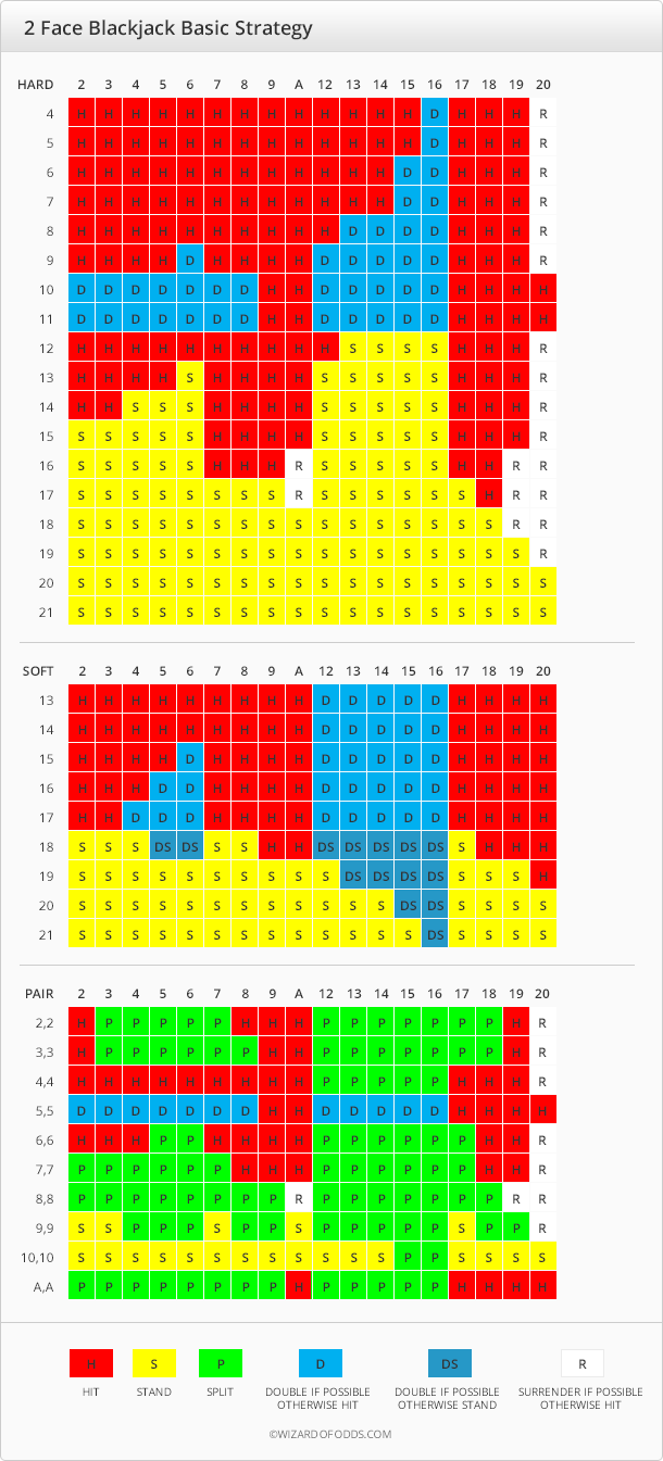 O Blackjack de Duas Faces é uma variante do blackjack em que o dealer revela sua carta fechada se a carta aberta for qualquer figura (valete, dama ou rei). Para compensar essa variação, o jogo utiliza baralhos de 48 cartas sem o valor 10, e um blackjack vencedor paga o valor apostado. Vi o jogo pela primeira vez no cassino Paris, em Las Vegas, no dia 18 de novembro de 2013.