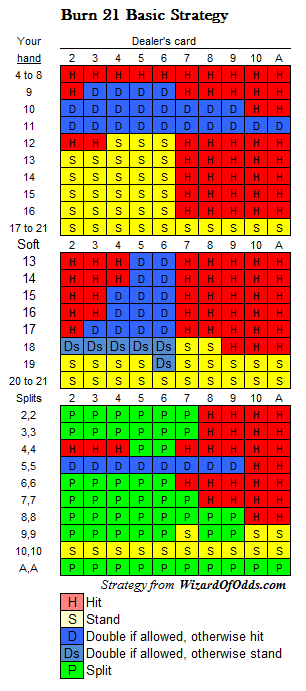 A aposta "Burn", por si só, é altamente desvantajosa. Mais especificamente, o jogador pode esperar perder 67,31% do valor apostado nela, antes mesmo de considerar qualquer benefício para a aposta no blackjack. Dado que o jogador deve apostar metade da sua aposta original na aposta "Burn", ele só deve optar por essa estratégia quando tiver a chance de melhorar o valor da sua aposta no blackjack em 67,31% * 50% = 33,65%. A estratégia a seguir mostra especificamente quando o valor da aposta "Burn" é superior a 33,65%, caso em que o jogador deve optar por essa estratégia.