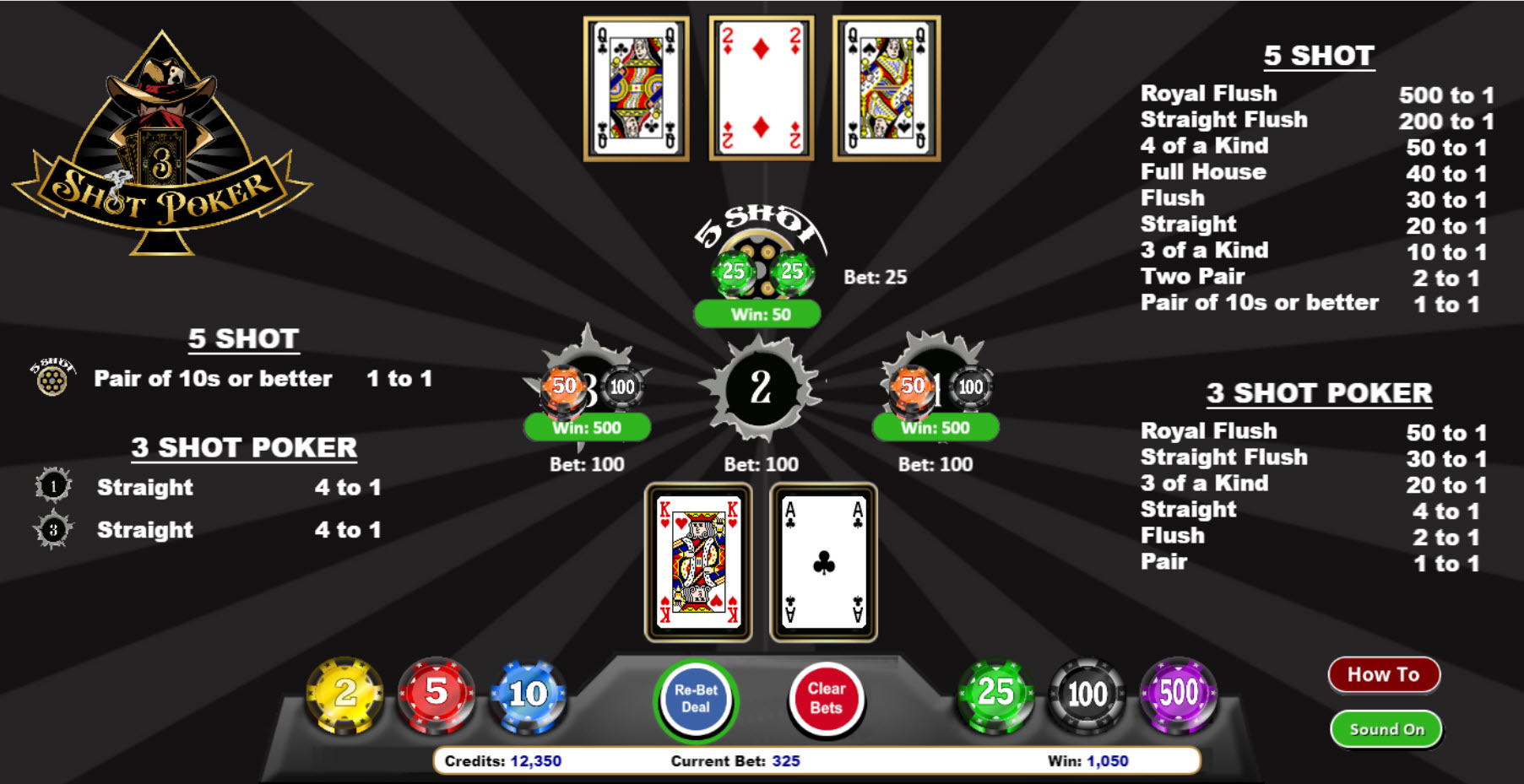 Nas tabelas de pagamento 1 e 3, quando uma sequência paga 5 para 1, o jogador também deve fazer as apostas 2nd e 3rd Shot com um projeto de sequência interna (incluindo A/2 e K/A).