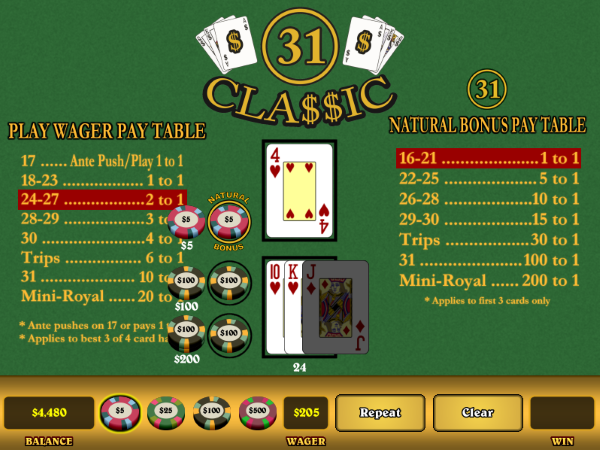 Na mão acima, eu tinha 20 pontos em copas após minhas três primeiras cartas, então fiz a aposta Play. A carta Draw foi o quatro de copas, totalizando 24 pontos em copas. Com 24 pontos no total, minha aposta Ante pagou o valor apostado e a aposta Play pagou 2 para 1. O bônus Natural 31 é pago com base nas minhas três cartas iniciais, que totalizaram 20 pontos, pagando 1 para 1.