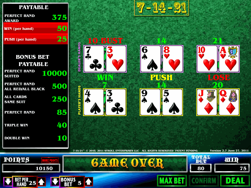 Aqui está um exemplo do jogo de demonstração gratuito 7-14-21. Apostei $25 em cada uma das mãos 7, 14 e 21, e $5 na Aposta Bônus.