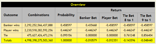 As tabelas de retorno a seguir mostram os possíveis resultados das apostas Jogador, Banqueiro e Empate em um jogo com 8 baralhos. Como mostram as células inferiores à direita em cada tabela, a vantagem da casa é de 1,06% na aposta no banqueiro, 1,24% na aposta no jogador e 14,36% no empate.