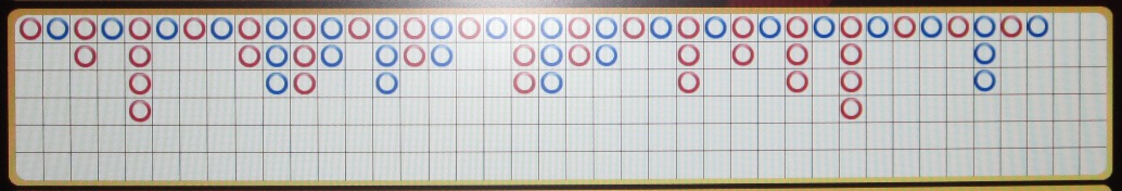 - Se a mão em questão criar uma nova coluna na Estrada Grande, compare a primeira e a quarta colunas à esquerda da nova coluna na Estrada Grande. Se elas tiverem a mesma profundidade, registre um círculo vermelho no Porco Barata. Caso contrário, registre um círculo azul.