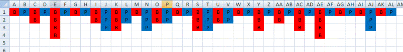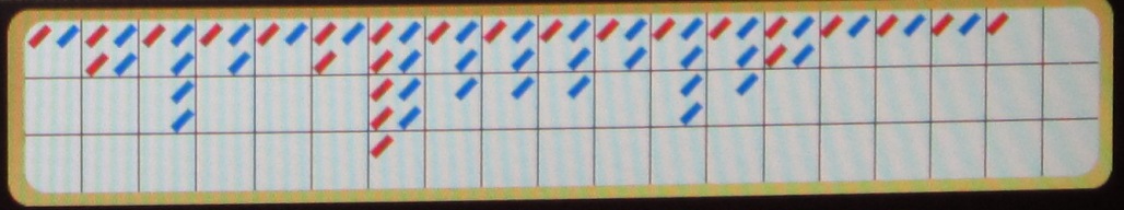 Na próxima mesa, já não é tão óbvio o que está acontecendo, e é aqui que comecei a precisar de ajuda. Como mencionei antes, os jogadores de bacará são um grupo muito supersticioso. Embora as estratégias que usam para encontrar padrões possam ser um assunto complexo, uma verdade básica é que eles gostam de previsibilidade e padrões repetitivos. Por exemplo, se as últimas 12 mãos fossem BBBPPPBBBPPP, eu apostaria que todos na mesa apostariam no Banqueiro na próxima mão. Observe como as vitórias acontecem em grupos de três. A tabela Big Eye Boy é útil para avaliar o quão repetitivo é o baralho. Entradas vermelhas são um sinal de repetição, e entradas azuis são um sinal de um baralho caótico e "irregular". É importante notar que, na tabela Big Eye Boy, o azul e o vermelho não estão associados às vitórias do Jogador e do Banqueiro, como acontece nas duas tabelas anteriores.