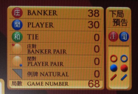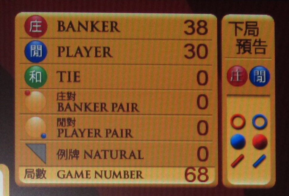 Por fim, a imagem acima mostra a parte superior direita da tela. A parte esquerda mostra as estatísticas gerais do baralho, indicando a frequência com que cada aposta foi vencedora. Este não é um exemplo muito realista, pois incluí apenas vitórias do Jogador e do Banqueiro, para fins de demonstração. A parte direita mostra o que acontecerá com as cartas Big Eye Boy, Small Road e Cockroach Pig, dependendo se a próxima mão for uma vitória do Jogador ou do Banqueiro.