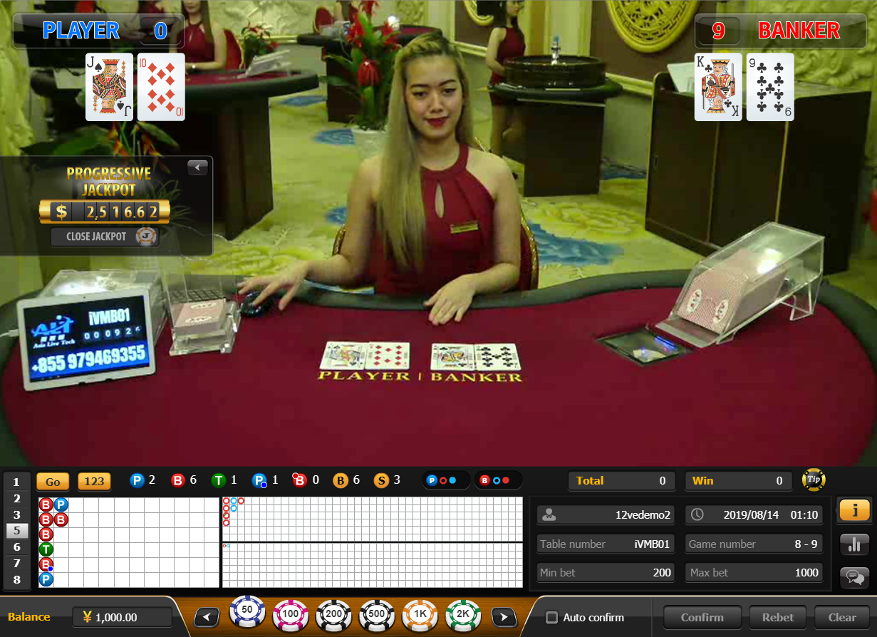O que eu chamo de Progressivo da Asia Live Tech é uma aposta paralela que vi em um cassino online com dealers ao vivo da Asia Live Tech. Eles simplesmente a chamaram de "progressiva", então o restante do nome é meu. Trata-se de um par de apostas paralelas, uma na mão do Jogador e a outra na mão do Banqueiro, que ganham se o lado escolhido for um rei ou um 9.
