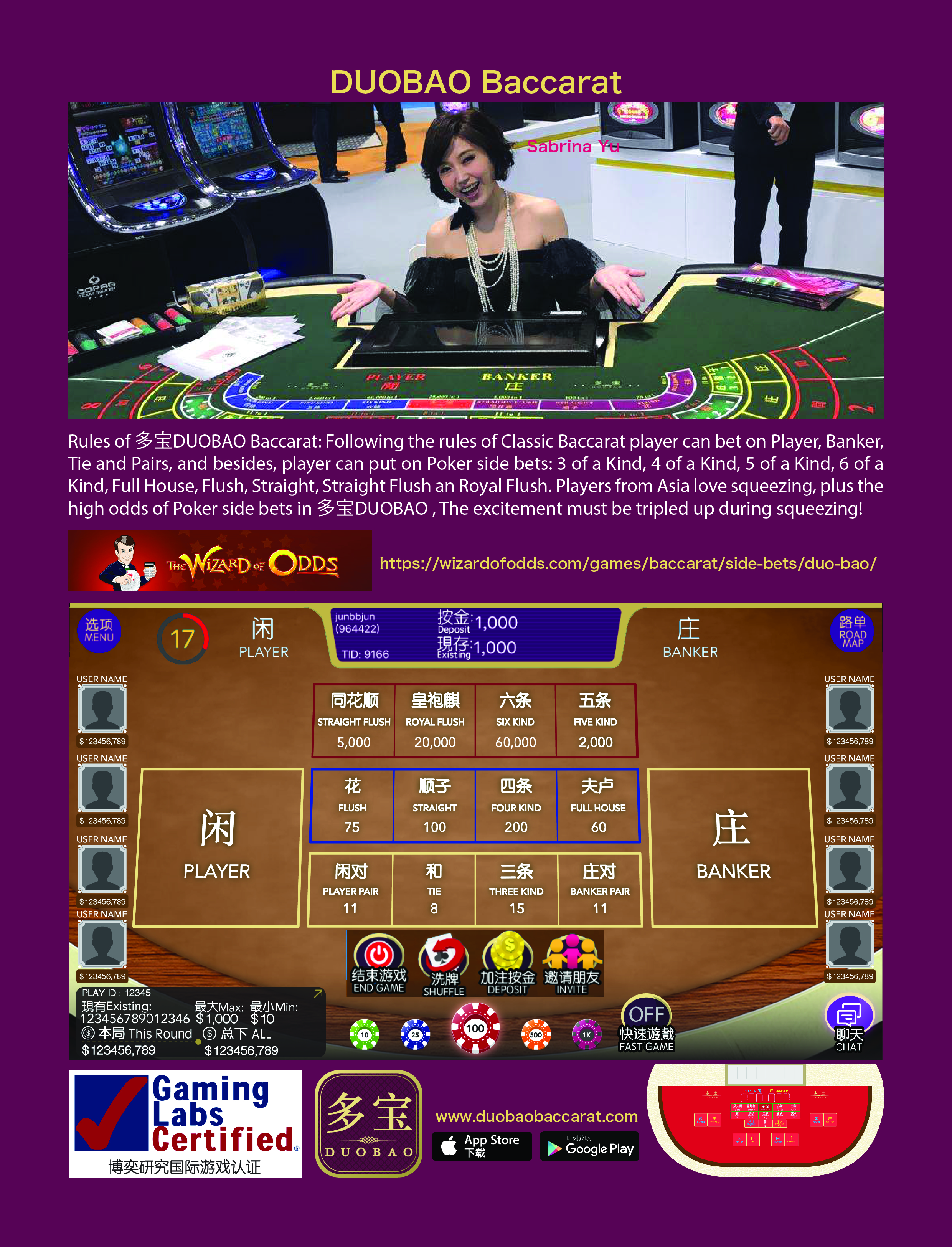 Se meu conhecimento de chinês estiver correto, Duo Bao significa "Muitos Tesouros". É um jogo de bacará com diversas apostas paralelas inspiradas no pôquer. Como as regras do bacará são as mesmas do bacará tradicional, vou classificar este jogo como uma coleção de apostas paralelas de bacará.