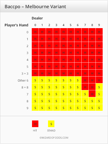 A tabela a seguir mostra a probabilidade e o retorno para todos os resultados possíveis da variante de Melbourne do jogo, assumindo a estratégia ótima. A célula inferior direita mostra uma vantagem da casa de 3,02%.