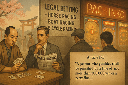 A legislação sobre jogos de azar no Japão é rigorosa. O Código Penal proíbe quase todas as formas de apostas com dinheiro , com algumas exceções como corridas de cavalos, certos esportes a motor e a loteria nacional.