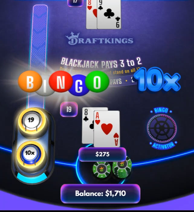 Bingo Blackjack é um jogo da DraftKings que paga um multiplicador se o total do jogador atingir um número aleatório entre 12 e 21, sorteado no início da rodada. Esse multiplicador é pago com uma taxa adicional de 20% por rodada.