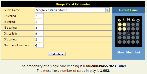 Se você deseja analisar cuidadosamente suas chances no bingo, precisa saber aproximadamente quantas cartelas estão em jogo. Minha nova e aprimorada calculadora de bingo estima o número de cartelas em jogo para 67 padrões diferentes, de acordo com a distribuição das bolas sorteadas (por letra) e o número de jogadores vencedores.