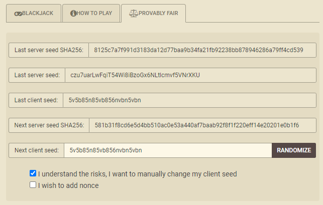 O programa irá variar os hashes da semente do servidor de acordo com o que foi fornecido antes da sua aposta e com as cartas distribuídas no jogo.