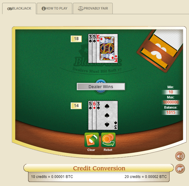 Na imagem acima, começo com uma aposta de 0,00001 BTC (Bitcoin), o que equivale a cerca de 10 centavos de dólar. Eles fazem o jogador usar essa aposta para comprar dez fichas e depois apostar as dez inteiras. Por que complicam as coisas com essa etapa, eu não sei.