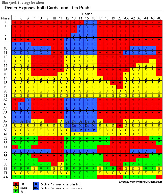Às vezes, acidentalmente ou como parte de uma promoção, o crupiê revela ambas as cartas. Isso não deve ser confundido com a dupla exposição , na qual o empate perde. A seguir, apresentamos a estratégia básica, baseada em um número infinito de baralhos, quando ambas as cartas do crupiê são reveladas e ele para no 17 suave.