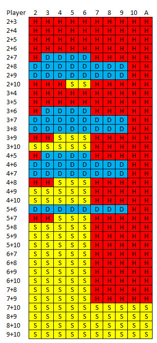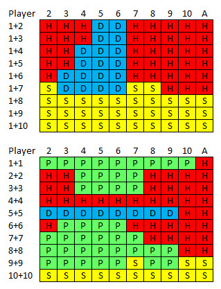A seguir, apresentamos a tabela de estratégia básica para todos os totais e pares de apostas.
