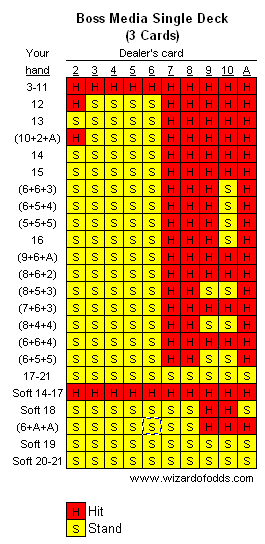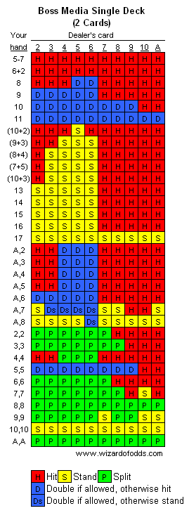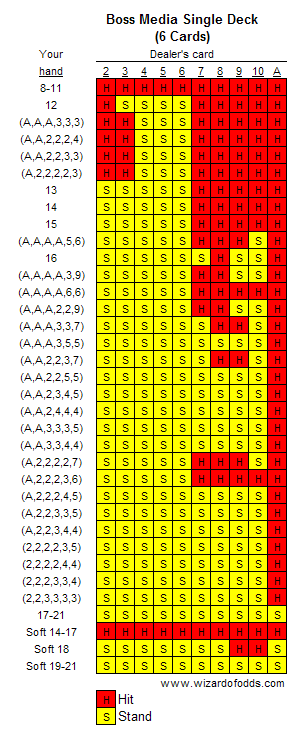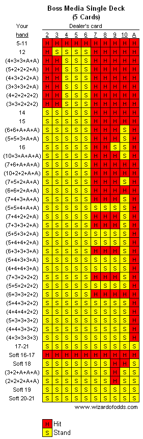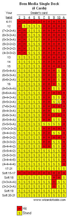 As tabelas a seguir são apropriadas para as regras da Boss Media. Elas também podem ser usadas sob as regras da Microgaming, exceto que o jogador não deve dobrar com 11 ou dividir oitos contra um 10 ou um ás, porque o dealer não verifica se há blackjack sob as regras do Blackjack Clássico da Microgaming. A Microgaming também não permite dobrar com 8.