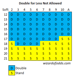 A estratégia correta para dobrar após dividir ases depende se o jogador pode dobrar por menos e se o dealer pede carta ou para no 17 suave. A tabela a seguir se aplica caso dobrar por menos não seja permitido, independentemente de o dealer pedir carta ou parar no 17 suave. A criação dessas tabelas considerou um baralho infinito. Uma fonte que respeito afirma que, na primeira tabela com seis baralhos, o jogador também deve dobrar no 18 suave contra 2 e no 19 suave contra 6.