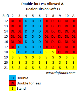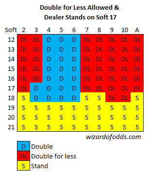 A próxima tabela se aplica se dobrar por menos for permitido, e o dealer parar no 17 suave.