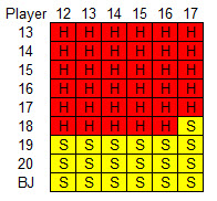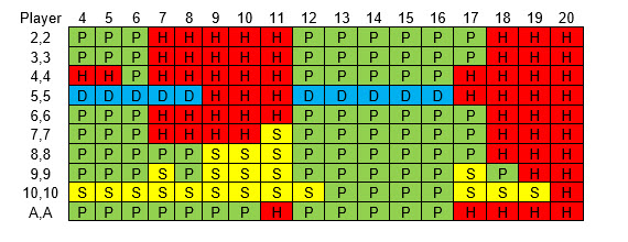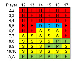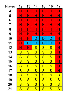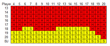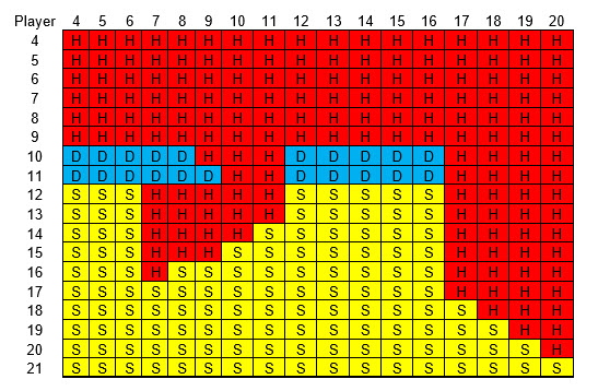 A estratégia para o Blackjack Face Up é bastante complexa. Entre o jogador ter um total rígido, um total flexível ou um par, e o dealer ter um total rígido ou flexível, existem seis estratégias diferentes, que apresento abaixo. Um total flexível do dealer de 18 a 20 deve ser tratado como um total rígido.
