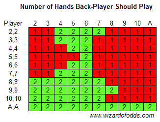 A primeira tabela abaixo mostra o número de mãos que o jogador da parte de trás deve escolher jogar. Isso se baseia em baralhos infinitos e é o mesmo independentemente de o dealer pedir carta ou parar com um 17 suave. Assume-se que dobrar após uma divisão seja permitido. Também inclui divisões obviamente ruins, que são incluídas para fins de completude, e não para sugerir que o jogador que controla a mão deva dividir. A tabela também assume que o jogador da frente continuará dividindo novamente, mesmo que seja uma jogada ruim.