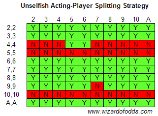 A próxima tabela refere-se a um jogador altruísta, que dividirá ou não a aposta de acordo com o benefício do jogador que está atrás. Isso pode acontecer se os dois jogadores estiverem em conluio e a aposta de trás for significativamente maior do que a do jogador que está agindo. A tabela mostra quando o jogador que está agindo deve dividir a aposta, assumindo que dobrar após a divisão é permitido e que o número de baralhos é infinito. Não importa se o dealer pede carta ou para em um 17 suave.