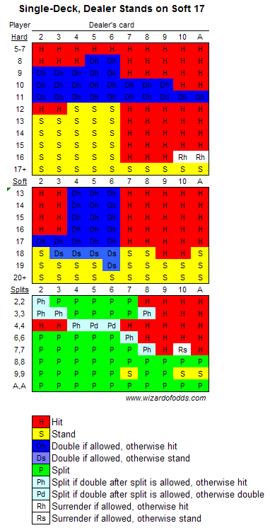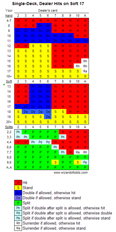 O Apêndice 1 da Boss Media apresenta uma estratégia básica dependente da composição para blackjack com um baralho, onde o dealer para no 17 suave.