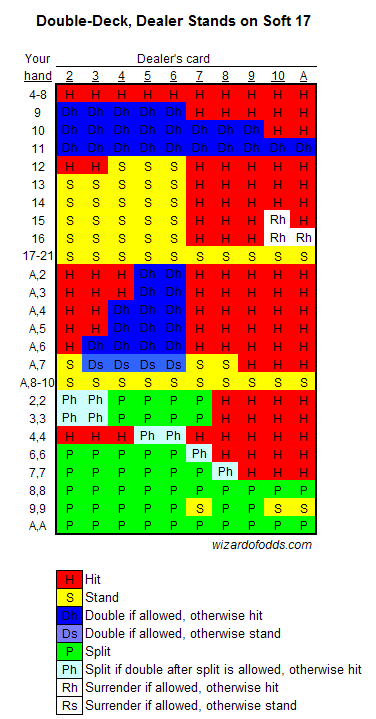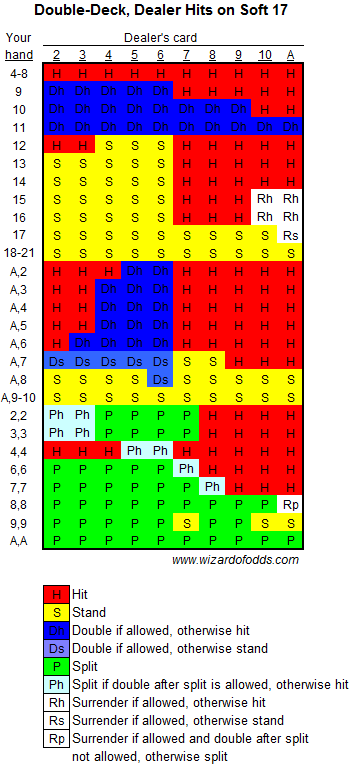 Idealmente, a estratégia básica mostra a jogada que, em média, resultará na maior vitória ou na menor derrota por mão inicial jogada. A maneira como costumo fazer isso é analisando apenas as mãos iniciais de duas cartas. Geralmente, isso resulta na melhor jogada geral. No entanto, um 18 suave contra um ás do dealer, quando o dealer para no 17 suave, representa a única exceção conhecida que eu conheço para qualquer número de baralhos. Como mostra meu apêndice 9 sobre blackjack , um 18 suave de duas cartas contra um ás tem um valor esperado de pedir carta de -0,100359 e de parar carta de -0,100502. Portanto, com duas cartas, é ligeiramente melhor pedir carta. Contudo, nem todos os 18 suaves são compostos por duas cartas. Quanto mais cartas o jogador tiver na mão, mais as probabilidades favorecem parar carta. Simulações mostram que, se forçado a sempre pedir carta ou sempre parar carta, é melhor parar carta. Gostaria de agradecer a Don Schlesinger por chamar minha atenção para essa jogada incomum.
