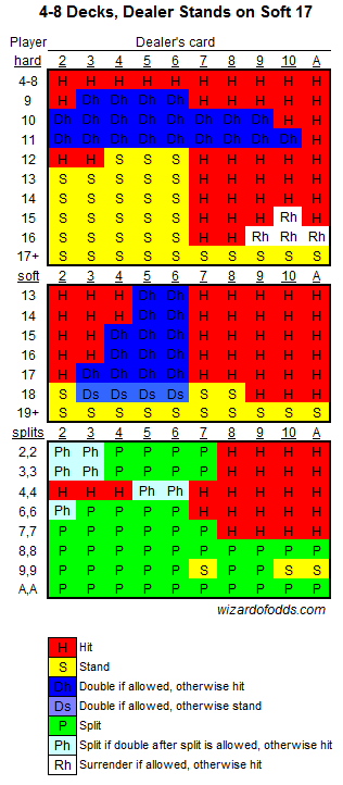 Para usar a estratégia básica, procure sua mão na borda vertical esquerda e a carta aberta do dealer na parte superior. Em ambos os casos, um A representa o ás. De cima para baixo, temos os totais rígidos, os totais flexíveis e as mãos divisíveis. As mãos divisíveis foram divididas em dois grupos, dependendo se dobrar após a divisão é permitido ou não. Em jogos com vários baralhos, dobrar após uma divisão geralmente é permitido, mas essa regra pode variar em jogos com um único baralho. No corpo da tabela, há células com códigos de cores que indicam a melhor jogada: H = pedir carta, S = parar, D = dobrar, P = dividir.