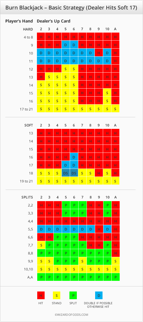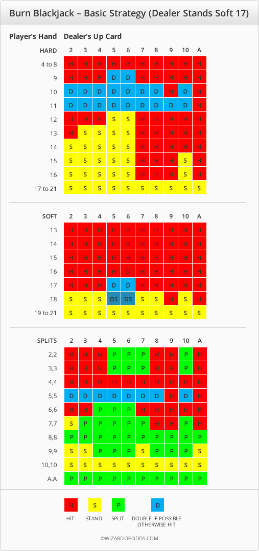 As tabelas a seguir mostram a estratégia básica, dependendo se o dealer pede carta ou para em um 17 suave: