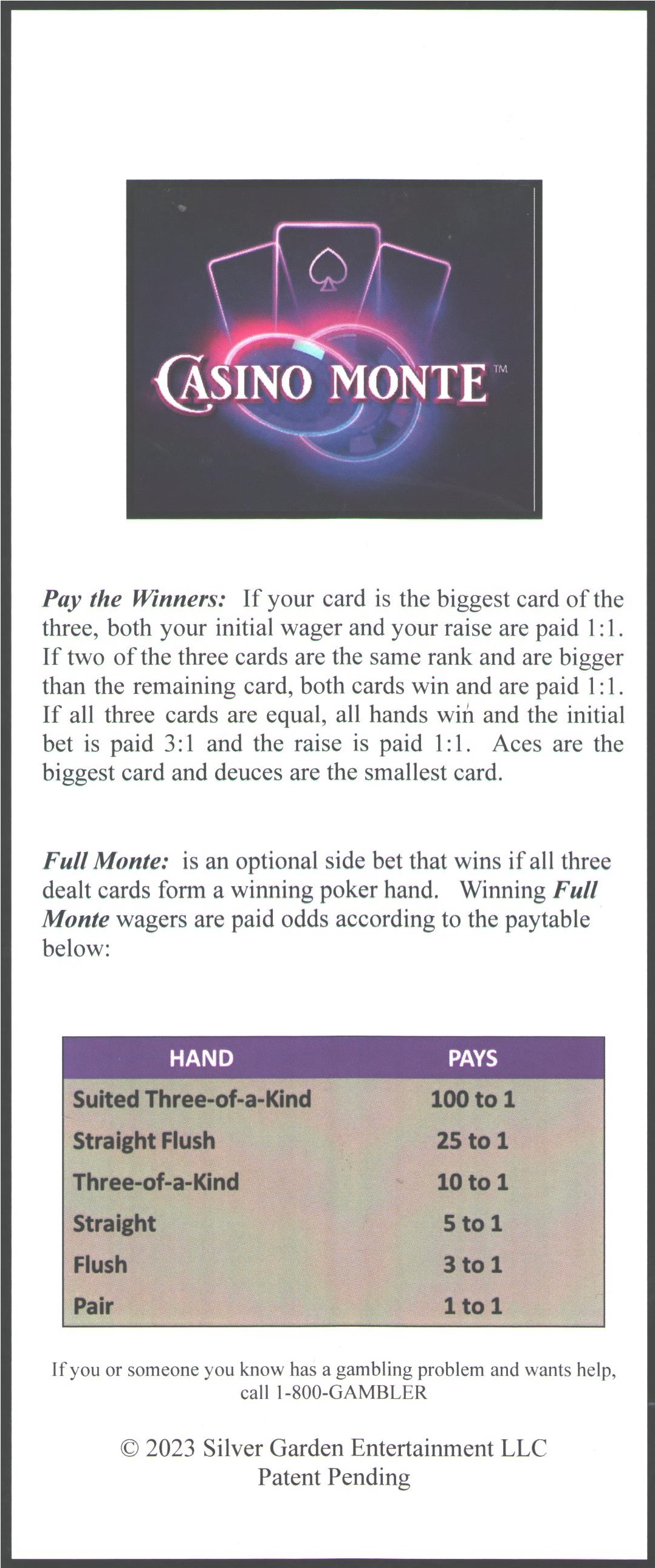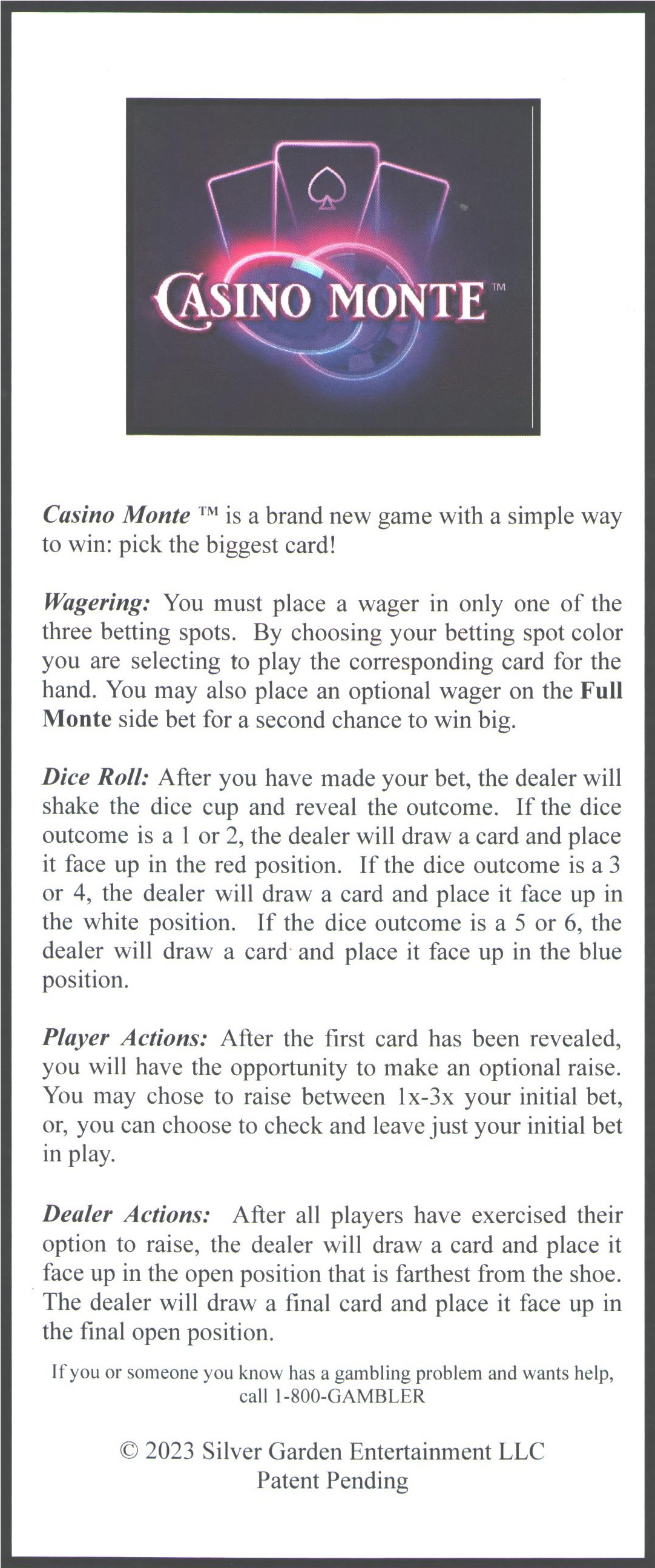 Casino Monte é um jogo de cassino simples que utiliza três cartas. O jogador ganha se acertar a posição que conterá as cartas de maior valor. Em caso de empate, o jogador vence e há a oportunidade de aumentar a aposta após a revelação de uma das cartas.