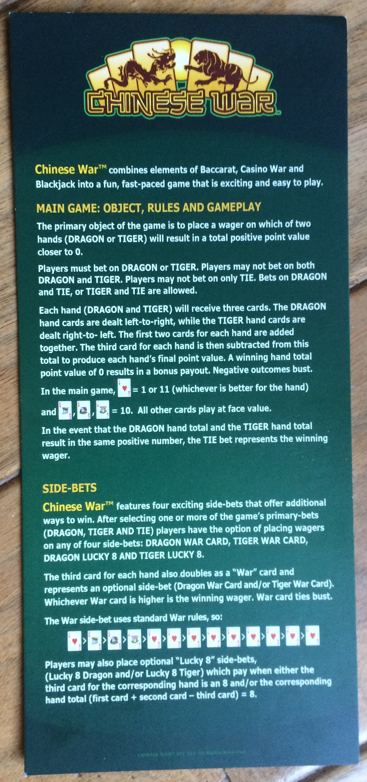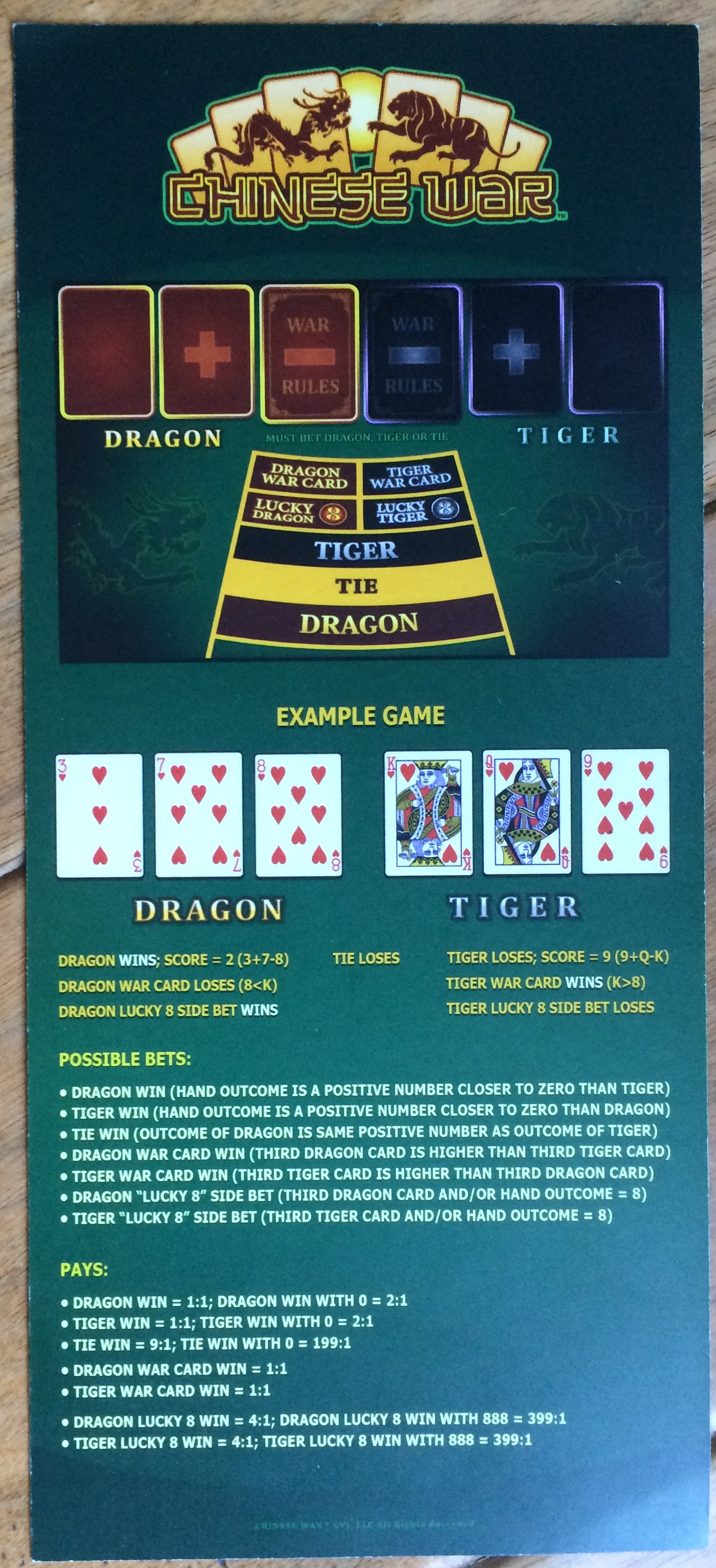 Chinese War é um jogo novo que descobri durante um teste no Gold Coast em Las Vegas, no dia 25 de janeiro de 2017. Se tivesse que compará-lo a outro jogo, diria que é uma mistura de Casino War , blackjack e bacará . Há sete apostas disponíveis, baseadas no resultado de duas mãos: o Dragão e o Tigre.