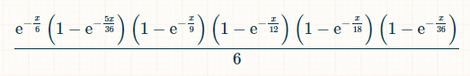 Em x unidades de tempo, a probabilidade de que os números 2, 3, 4, 5 e 6 tenham sido rolados, e o 7 não, é: (1-exp(-x/36))*(1-exp(-x/18))*(1-exp(-x/12))*(1-exp(-x/9))*(1-exp(-5x/36))*exp(-x/6). A probabilidade de que, no instante x, o jogador role um 7, tendo anteriormente rolado todos os totais de 2 a 6, é:
