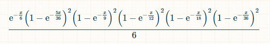 Como um 7 vencedor pode ocorrer a qualquer momento, a probabilidade de ganhar é a integral dessa probabilidade em relação a x, de 0 ao infinito. Não que precisemos saber, mas a integral, antes de aplicar os limites de integração, é (-6*e^(-x/6)+(72*e^(-(7*x)/36))/7+(9*e^(-(2*x)/9))/2-8*e^(-x/4)-(18*e^(-(5*x)/18))/5-(72*e^(-(11*x)/36))/11+(72*e^(-(13*x)/36))/13+(108*e^(-(7*x)/1) 8))/7+(24*e^(-(5*x)/12))/5-(27*e^(-(4*x)/9))/4-(216*e^(-(17*x)/36))/17-10* e^(-x/2)-(72*e^(-(19*x)/36))/19+(27*e^(-(5*x)/9))/5+(144*e^(-(7*x)/12))/7+ (54*e^(-(11*x)/18))/11-(72*e^(-(23*x)/36))/23-(15*e^(-(2*x)/3))/2-(216*e^( -(25*x)/36))/25-(54*e^(-(13*x)/18))/13+(8*e^(-(3*x)/4))/3+(54*e^(-(7*x)/9) )/7+(72*e^(-(29*x)/36))/29-(72*e^(-(31*x)/36))/31-(9*e^(-(8*x)/9))/8-(24*e ^(-(11*x)/12))/11+(18*e^(-(17*x)/18))/17+(72*e^(-(35*x)/36))/35-e^(-x))/6.
