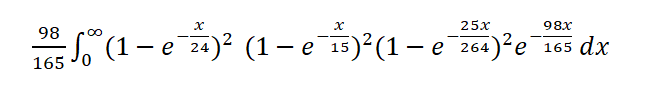 Integrar isso manualmente seria muito trabalhoso e propenso a erros. Felizmente, existem calculadoras de integrais . Para usar uma para este problema, clique no link e insira o seguinte na caixa de texto na parte superior: (1-exp(-x/24))^2*(1-exp(-x/15))^2*(1-exp(-25x/264))^2*exp(-98x/165)/(165/98). Em seguida, clique em "Opções" e defina o limite inferior como 0 e o limite superior como infinito. Depois, clique em "Executar".