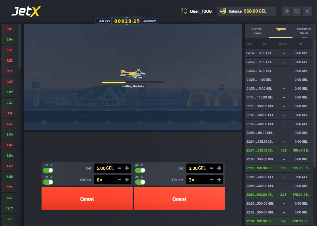 Antes de fazer as duas apostas, eu tinha um saldo de 975 GEL. Para ser sincero, não faço ideia do que seja GEL. O jogo estava no modo diversão. Fiz duas apostas, como mostrado na imagem acima. A primeira aposta, mostrada na caixa no canto inferior esquerdo, é de 5 e tem um retorno de 8x o valor apostado, o que equivale a 40. A segunda aposta, mostrada na caixa no canto inferior direito, é de 2 e tem um retorno de 3x o valor apostado, o que equivale a 6. Depois que essas apostas foram confirmadas, antes desta captura de tela ser feita, meu saldo foi reduzido em 7, ficando com 968, como você pode ver no campo de saldo na parte superior.