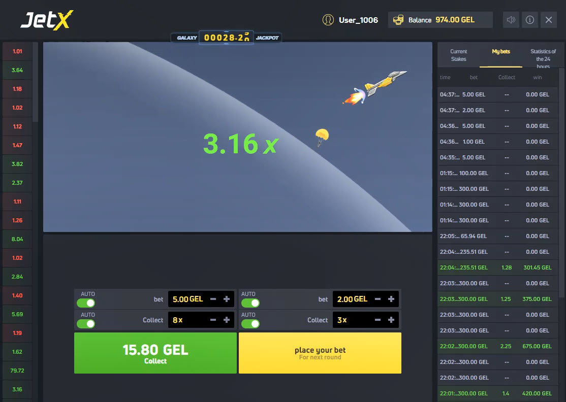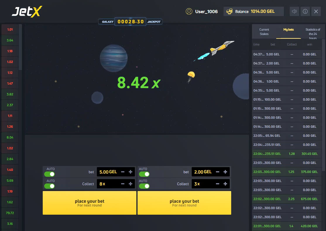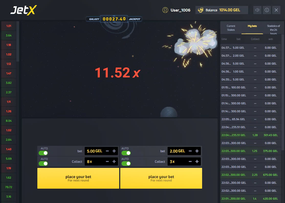 Não que isso importasse, mas a nave espacial continua subindo até explodir, o que neste caso aconteceu com um multiplicador de 11,52x. Observe também meu saldo de 1014 GEL. Lembrando que, após fazer minhas apostas, meu saldo era de 968. A aposta do lado esquerdo retornou 5×8 = 40. A aposta do lado direito retornou 2×3 = 6. Meu ganho total foi de 40 + 6 = 46. Meu novo saldo é, portanto, 968 + 46 = 1014.