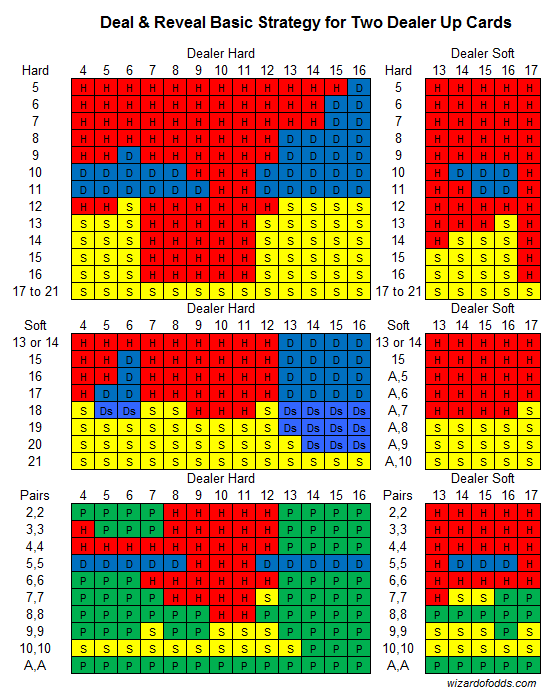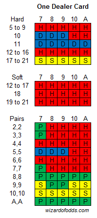 A próxima tabela mostra a estratégia contra uma carta aberta do dealer, que é a mesma do blackjack regular para quatro a oito baralhos, quando o dealer pede carta com um 17 suave.