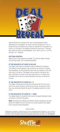 Deal & Reveal é uma variante do blackjack com algumas diferenças. A principal delas é que, se o dealer tiver uma mão de 2 a 6, ele revelará sua carta fechada antes da vez do jogador.