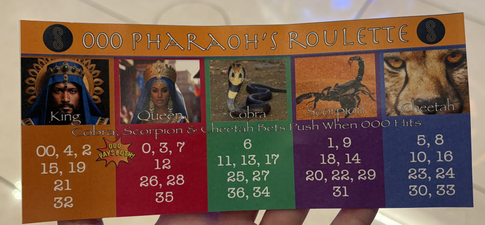 A Roleta do Faraó é um conjunto de cinco apostas paralelas. Ela foi vista no cassino Sahara, em Las Vegas, em outubro de 2025.