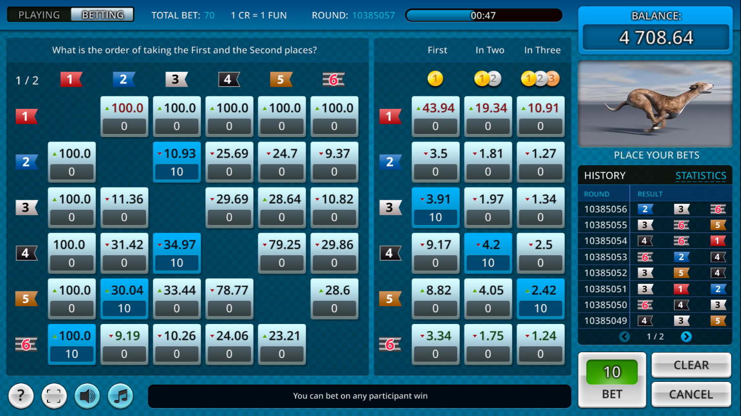 Dogs 3D é um jogo de simulação de corrida de cães da InBet Gaming. O conceito é bem simples: seis cães em uma corrida. O jogador pode fazer apostas em vitória, segundo lugar, terceiro lugar e exacta. Aqui está um resumo do que cada uma dessas apostas significa: