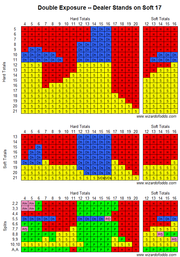 As tabelas a seguir mostram a estratégia básica para dupla exposição quando o dealer para no 17 suave. Para usar a estratégia, consulte a mão do jogador na linha superior e a mão do dealer na coluna da esquerda.