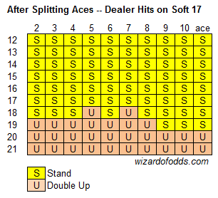 A estratégia a seguir mostra a estratégia após dividir ases, quando as únicas opções são parar ou dobrar a aposta.