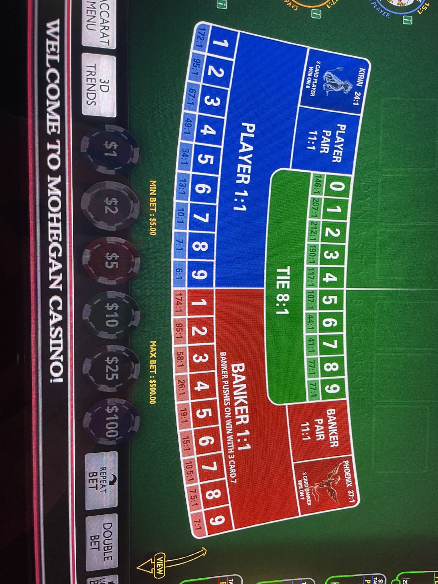 Algumas mesas de bacará oferecem apostas paralelas no resultado exato da partida (ou empate) e no total de pontos (ou de empate). A imagem abaixo mostra um exemplo dessas apostas em uma mesa de jogo eletrônica na Global Gaming Expo de 2024.