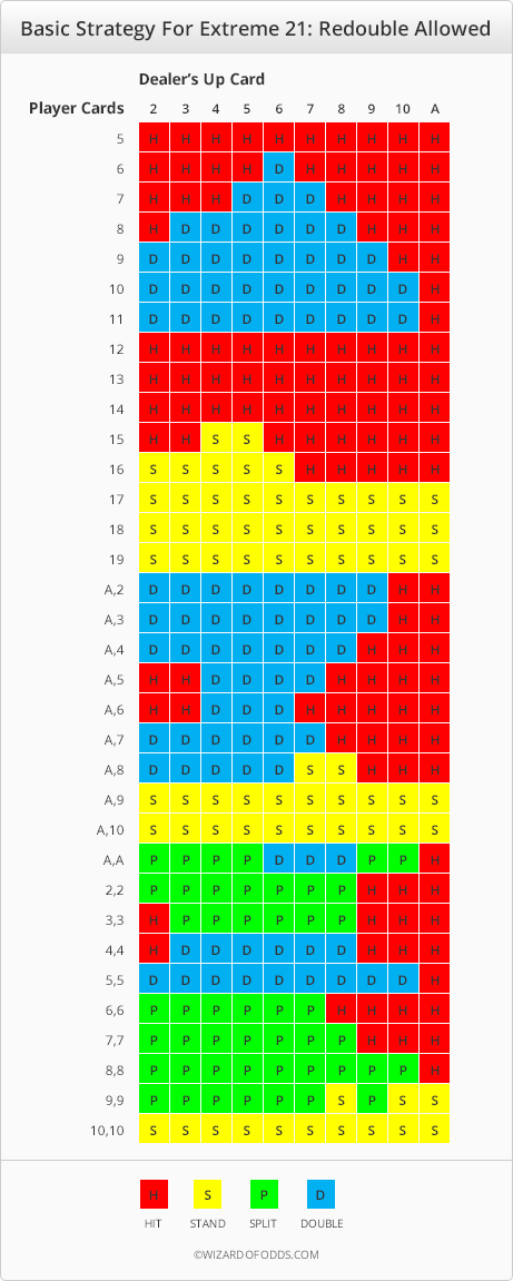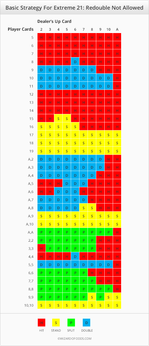 A próxima tabela mostra a estratégia básica para o Extreme 21 caso não seja permitido redobrar.