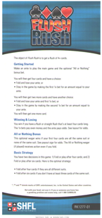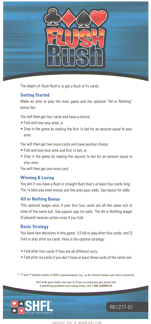 Flush Rush é um novo jogo de mesa que descobri no cassino D em Las Vegas, em maio de 2014. O jogo combina a ênfase em flushes do High Card Flush com a estrutura de apostas de aumento ou desistência do Mississippi Stud . Quanto mais longo for o flush, ou straight flush, na mão final do jogador, mais ele ganha.