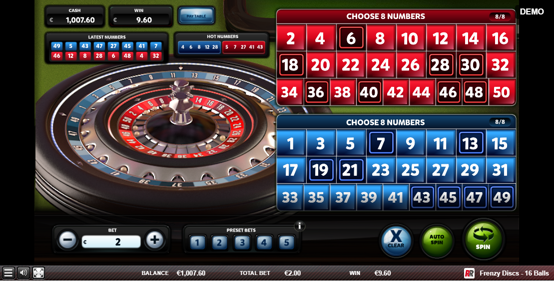 Frenzy Disks (16 Números) é uma variação da roleta criada pela Red Rake Gaming . Duas rodas concêntricas possuem 25 números e 8 bolas cada. Assim como no keno, o objetivo é prever em quais números as bolas irão parar.