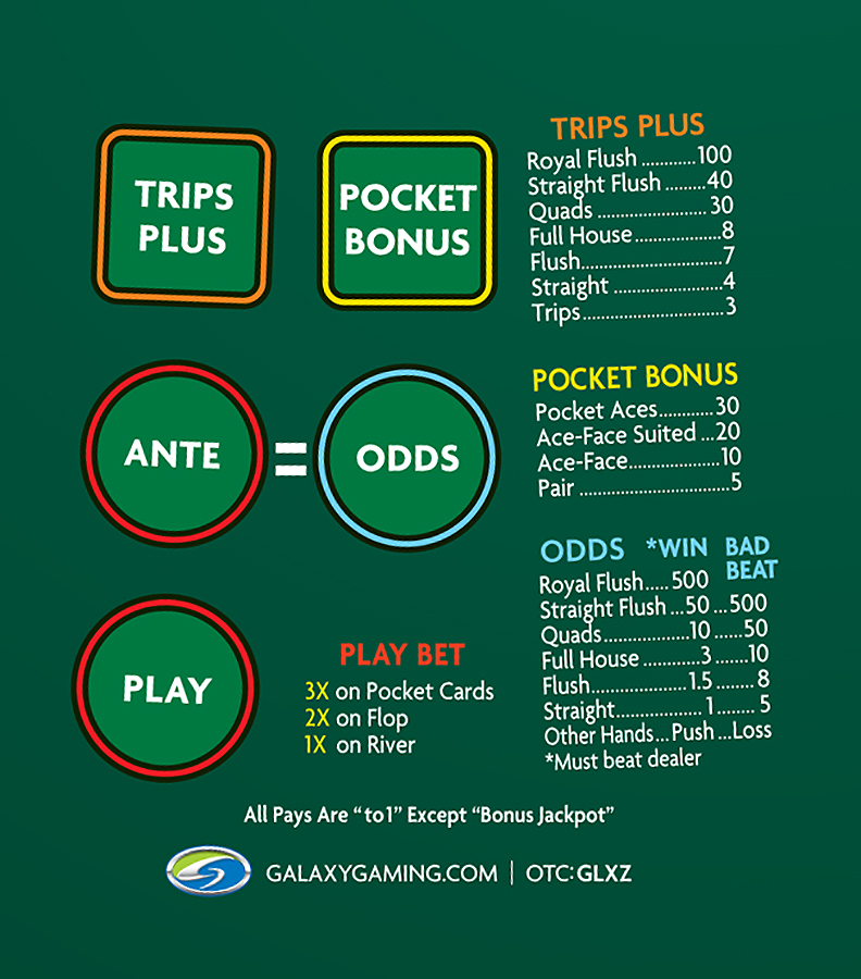 Mão Tabela de Pagamento 1 2 3 4 Straight Flush 500 500 500 500 Quads 50 50 50 25 Casa cheia 10 10 10 6 Descarga 8 6 5 5 Direto 5 5 4 4 Todos os outros Perda Perda Perda Perda - Além disso, existem duas apostas paralelas, que pagam com base apenas nas cartas do jogador: Trips Plus e Pocket Bonus. Essas apostas paralelas serão explicadas após a análise do jogo base.