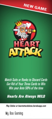 Heart Attack é um jogo de mesa que, pelo que sei, fez sua primeira aparição no cassino Foxwoods em Connecticut, no início de 2019. As regras são difíceis de comparar com as de outros jogos conhecidos. Se forçado a jogar, é um pouco como Uno, onde o jogador tenta se livrar das cartas combinando-as com as cartas jogadas pelo crupiê em valor ou naipe. Para dar um toque especial, as cartas de copas são curingas.